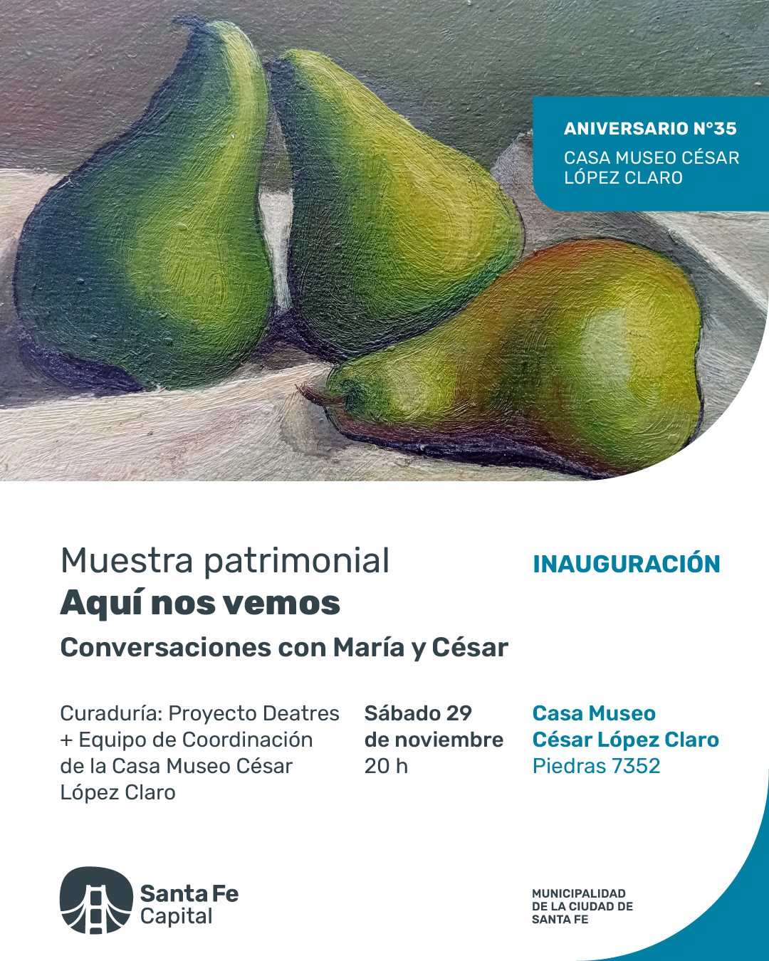 En el marco del Aniversario N°35 de la Casa Museo César López Claro (Piedras 7352), el sábado 29 de noviembre a las 20 h se inaugurará la muestra patrimonial “Aquí nos vemos. Conversaciones con María y César” con curaduría del Proyecto Deatres y el Equipo de Coordinación de la Casa Museo César López Claro. La actividad es con ingreso libre y gratuito.