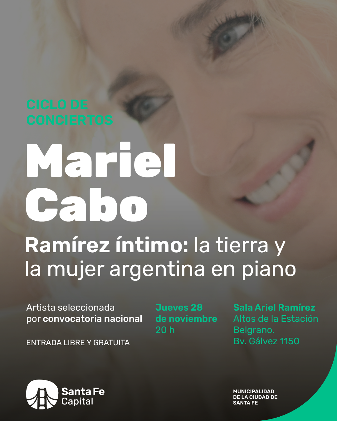 Mariel Cabo es pianista, nacida en Gálvez (Santa Fe). Se formó en el Liceo Municipal de su ciudad y siguió estudios superiores en el Instituto Superior de Música dependiente de la Universidad Nacional del Litoral, obteniendo las titulaciones de Licenciatura y Profesorado de Música con orientación en Piano, con el mejor promedio en la segunda. En este concierto, su interpretación propone un viaje emocional por la obra de Ramírez: desde la precisión técnica hasta la hondura poética de un repertorio que late en la identidad colectiva.