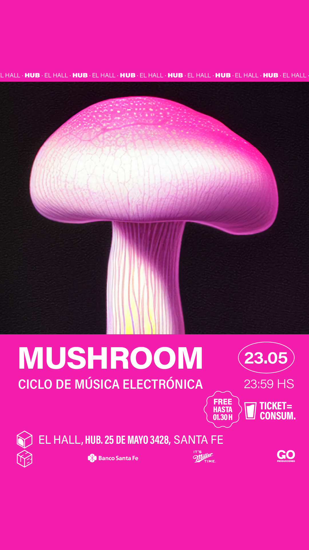 El viernes 23 de mayo a las 23.59 h, una nueva edición de Mushroom (Club de Amigos & Música Electrónica) llega para vivir las mejores trasnoches en El Hall. Entrada free hasta las 1.30 hs. Luego de esa hora, adquirí tu ticket válido por una consumición en HUB.