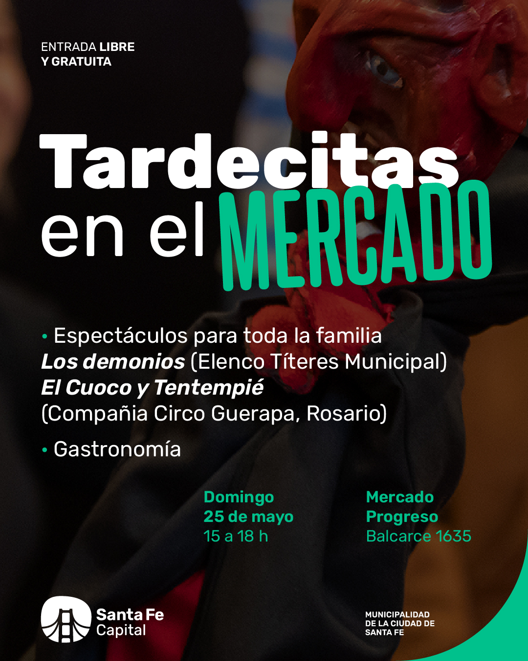 En una una nueva edición de Tardecitas en el Mercado, el domingo 25 de mayo de 15 a 18 h, se presentará el Elenco de Títeres Municipal con “Los demonios” y la Compañía “Circo Guerapa” con “El Cuoco” y “Tentempié”. Entrada libre y gratuita.