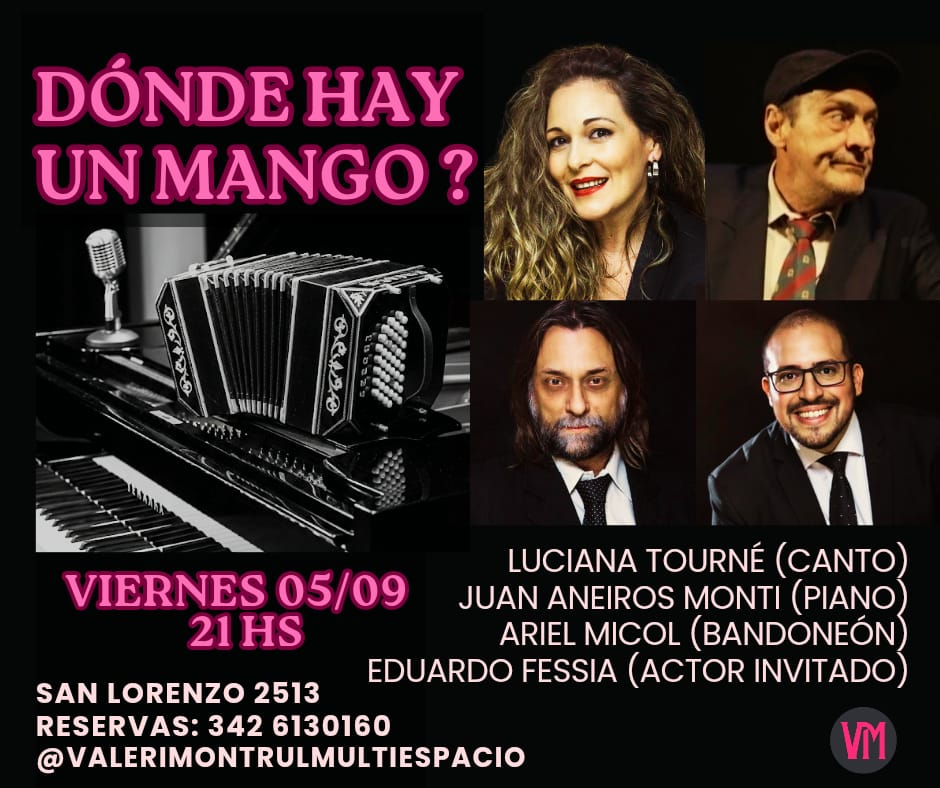 Recital de Tangos, milongas y humor. Luciana Tourné (canto), Ariel Micol (bandoneón), Juan Aneiros Monti (piano), Eduardo Fessia (actor).