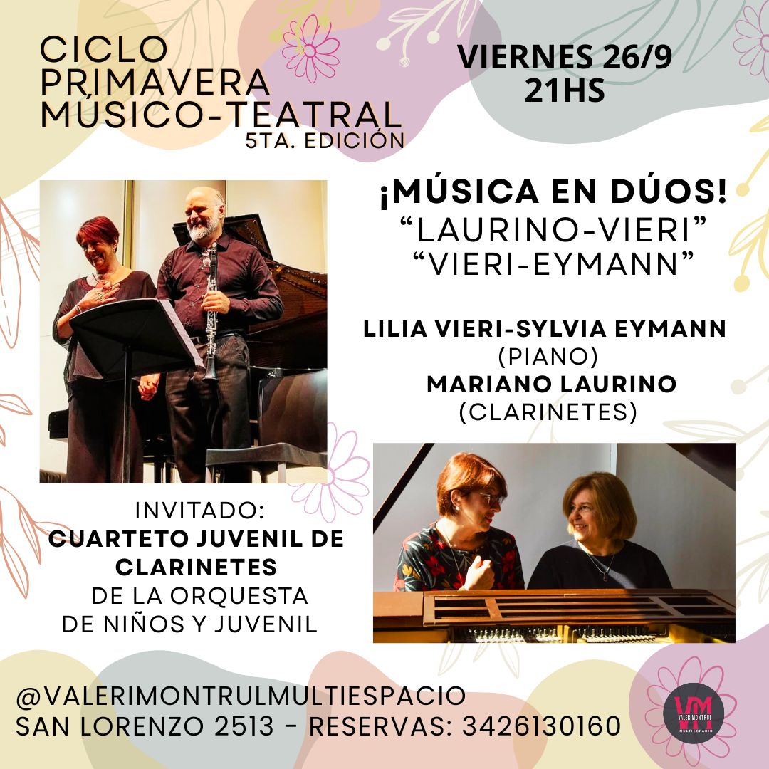 Dúos Laurino-Vieri (clarinetes, piano) Vieri-Eymann (piano), invitados: Ensamble de clarinetes Escuela de Música Nro. 9901, Orquesta de niños y Juvenil a cargo del Prof Omar Lacuadra. Obras de Schubert, Eugene Bozza, W.A. Crosse, Astor Piazzolla, Guastavino, Diana Rud.